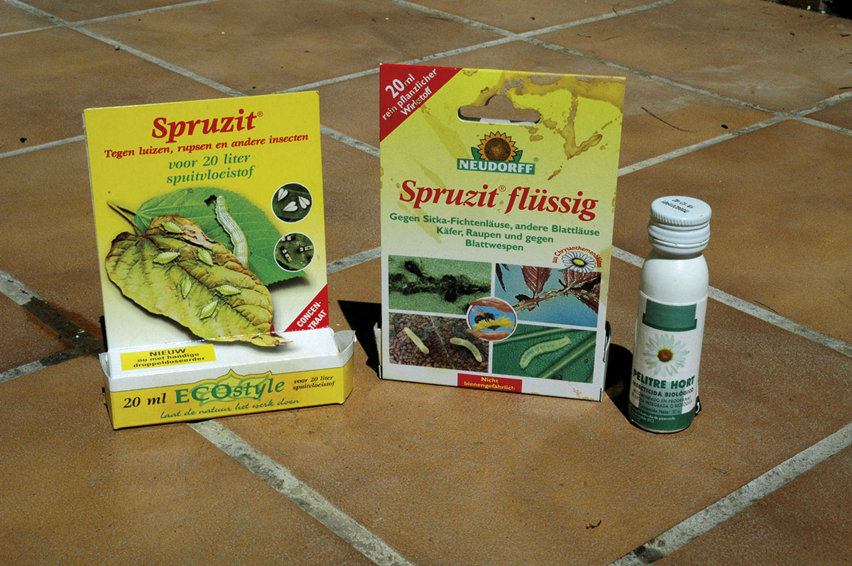 Jabón potásico. También llamado jabón insecticida, actúa por contacto, es decir, tiene que tocar a los bichos para matarlos, por eso hay que fumigar muy bien para mojar todas las partes de la planta, también la cara inferior de las hojas. Ideal contra cochinillas, arañas rojas, trips, mosca blanca, pulgón… Va muy bien mezclado con otros insecticidas para potenciar su efectividad. Dosis: 10-20 ml/l.